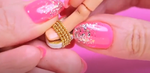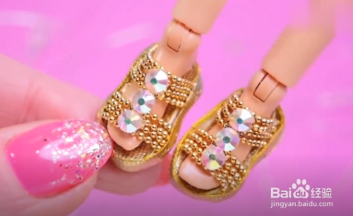如图所示,把链带粘到鞋子上,穿到芭比的脚上