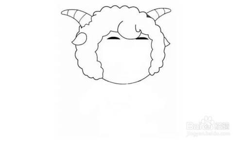 然后画出额头中间的刘海,尖尖 的弯向右边,再画出头顶两边的羊角,因为我们画的不是喜羊羊的正面图,所以两只羊角不太一样,接着画出羊角上的螺旋和喜羊羊的下巴。
