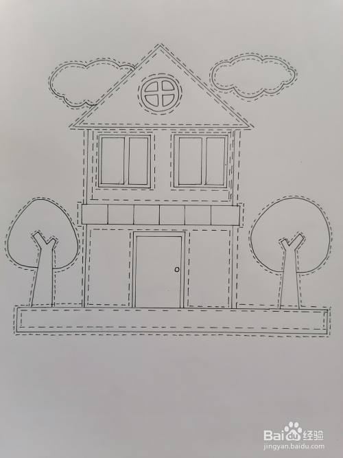 在屋顶两侧画两朵云,在屋子两旁画两棵树,同样要在周围画一些虚线