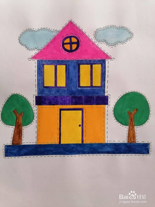 用玫红、普蓝、青莲、藤黄、桔黄水彩涂好屋子的屋顶、外墙、窗户、窗框和大门
