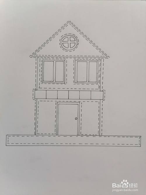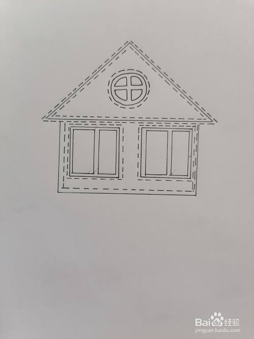 首先在纸上画出布艺小屋的屋顶和小圆窗,下面画两个长方形窗户,周围画一些虚线