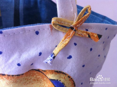 取一块小布条打个蝴蝶结装饰在兜带上,即可。