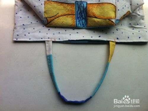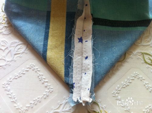 将兜口的表布和里布都向内折,用笔标出放兜带的位置,将兜带放上,将兜边转圈缝上,兜子就做好了。