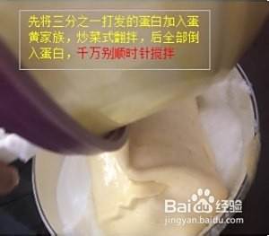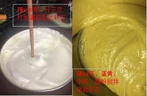 打发的蛋白和蛋液分步集中,注意集中方式。