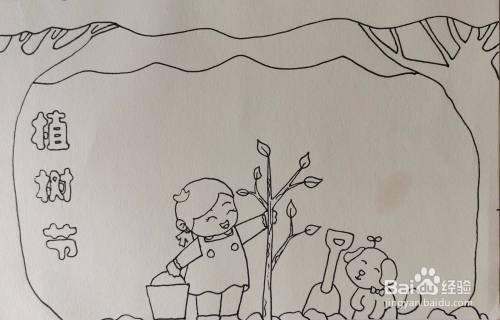 在画面的左边画出遮挡了一半的大树,顶部用波浪线表现出树叶。