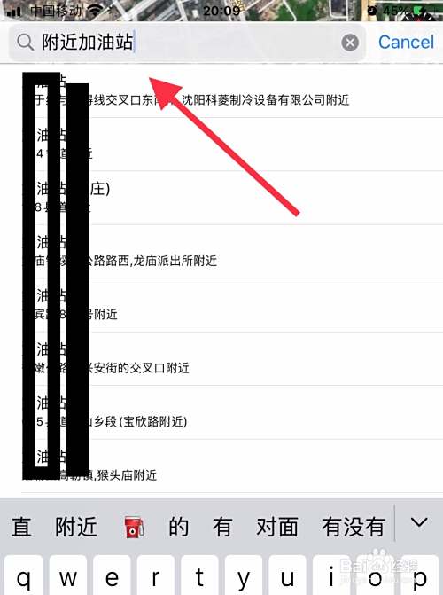 我们可以点击下方搜索,搜索我们想去的地方,比如说搜索附近的加油站,然后下面就会出现附近很多加油站。