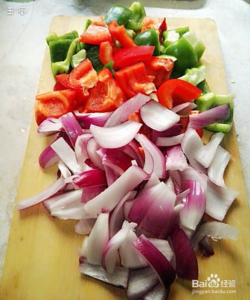 把柿子椒都切成片,洋葱也切成片,每次切洋葱都双眼泪汪汪,让宝宝心疼也好,说妈妈都累哭了。好爱哦。香葱切成段,大蒜切碎。