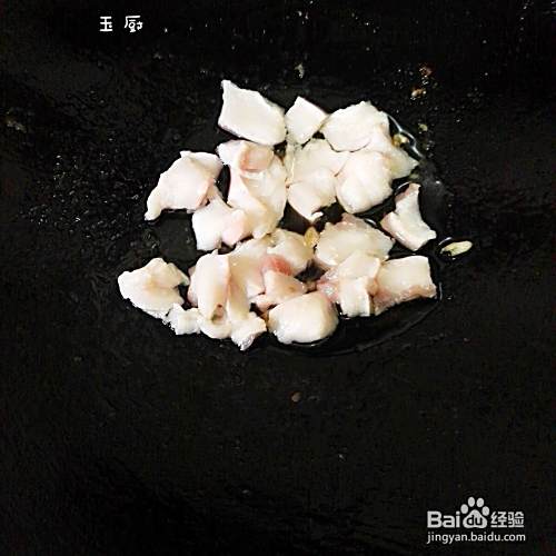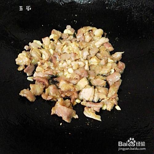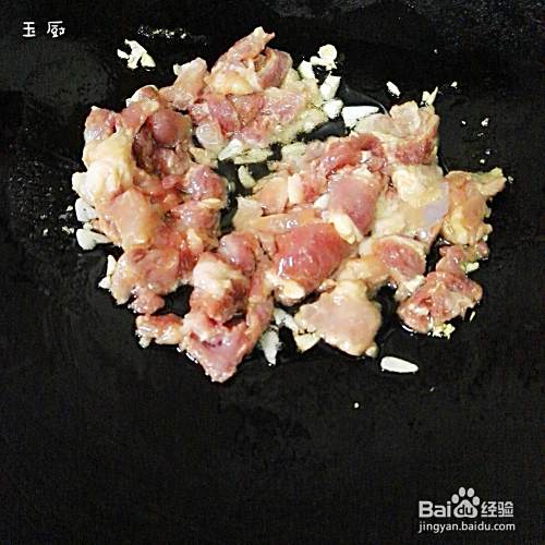 锅烧七成热放少量花生油,再小火爆香大蒜,再把猪肉倒进去开大火爆炒。一般炒到肉变成白色就差不多熟了,再铲出来备用。