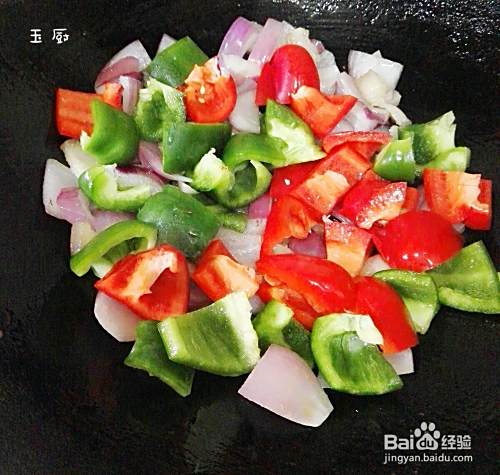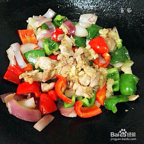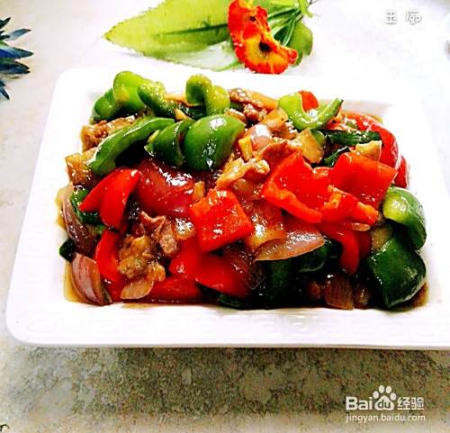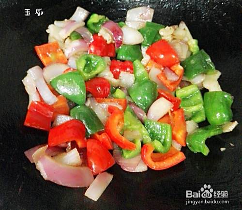 洋葱炒软了就把主角柿子椒倒进去,大火爆炒,一般炒二分钟炒断生就可以了。