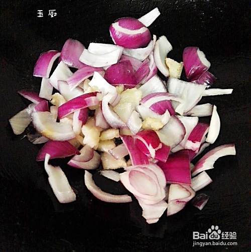 再把肥肉放进去炒一下,炒出油了,就把洋葱先倒进去炒,因为洋葱炒熟一点好吃一点。