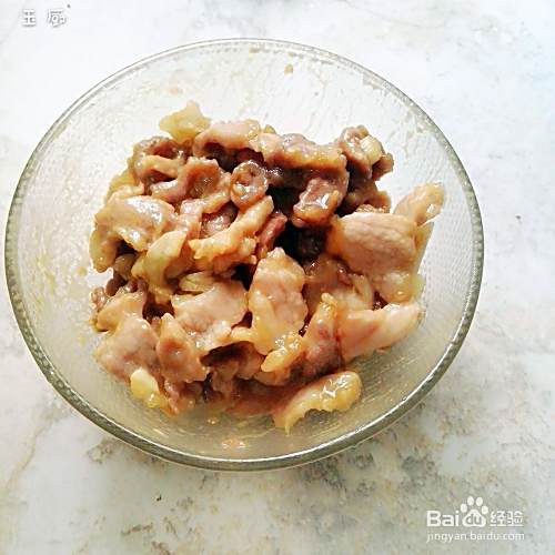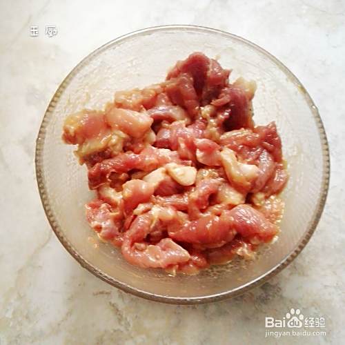 把猪肉洗干净,切片,再用生粉蚝油盐腌五分钟。