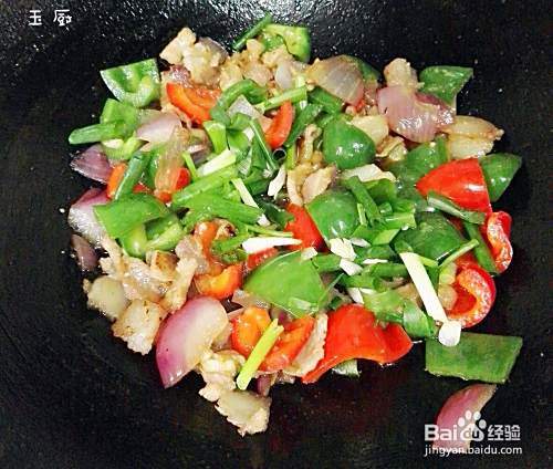 再把炒好的猪肉放进去,放盐,放香葱,再放少量淀粉水,再稍稍炒一下,收汁。