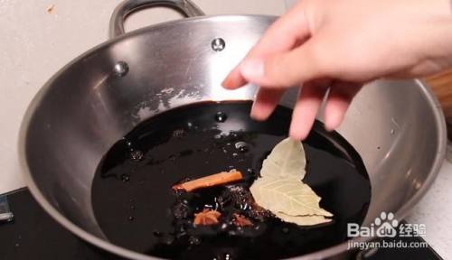 第三:在锅中倒入准备好的生抽,再放入一大勺糖,放入桂皮,香叶,两个八角,花椒,大火烧开,然后晾凉备用
