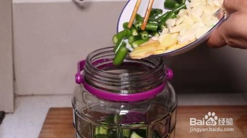 第五:将腌制好的黄瓜放入无油无水的罐子中,然后将切好的蒜,姜,辣椒也倒入罐子中,最后倒入晾晾的料汁,腌制一晚上就可以吃了