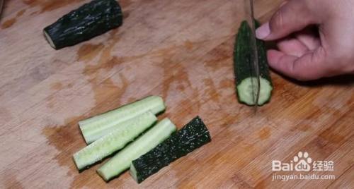 第一:首先我们将准备好的黄瓜清洗干净,然后控干表面的水分,去掉头尾,然后先切成段,再将黄瓜一分为4,切成5-6cm左右的长条,盛入盆中