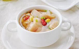 猪蹄汤:此汤肉质粑烂,汤浓,有补气血、增乳汁之功。适用于气血虚弱而致乳房不丰满或产后缺乳,面色不华,食欲不振,脉细弱。