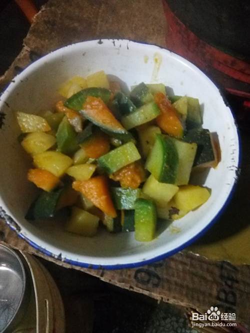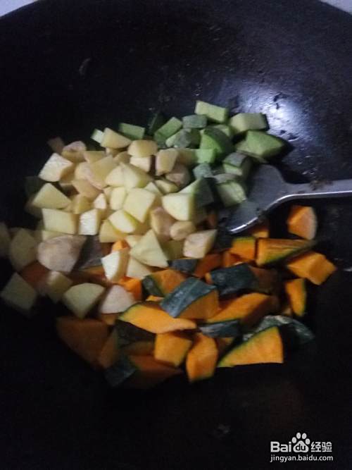 将南瓜块,放入锅里。再将绿萝卜块和土豆块,也放入锅里。再填入适量凉清水。等将锅里的菜,都炖熟了后,关火!放入盐,酱油,十三香。拌匀!