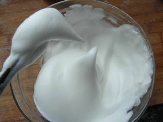 低筋面粉、泡打粉、蛋黄和牛奶混合,搅拌均匀,倒入蛋清糊,搅拌均匀。