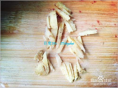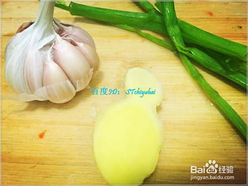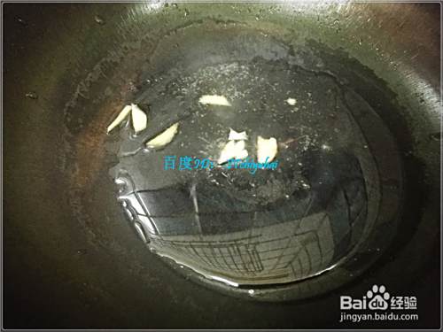 准备一小把新鲜的菠菜,将其如上面一样处理一下,切成小段状;准备少许生姜、蒜头,分别处理好。