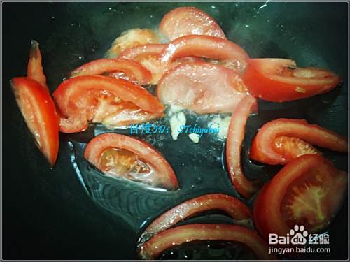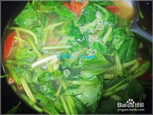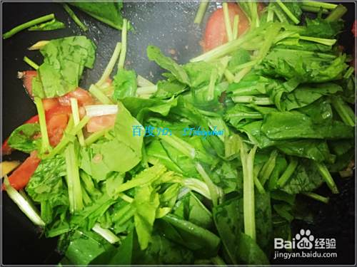 倒入西红柿片炒一会,然后加入菠菜,稍微翻炒一阵后加入适量的水,大火将水烧开。