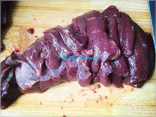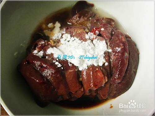 准备一块猪肝,过水清洗一阵,然后将其切成小片状,取一个干净的碗,将猪肝放入碗中,加入少许盐巴、酱油、料酒、醋、生粉,揉搓均匀,放在边上腌一会。