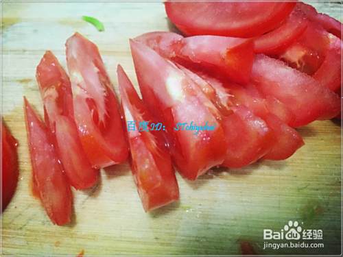 先处理西红柿,将西红柿洗净,先对半切开,剜去蒂头部分,然后沿着中心切成小瓣状。准备一两个鸡蛋,将鸡蛋磕破,蛋黄、蛋清倒入碗中,用筷子拌匀。