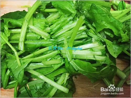 先处理菠菜,将菠菜减去根头部分,然后清洗几遍,将其对半切开。