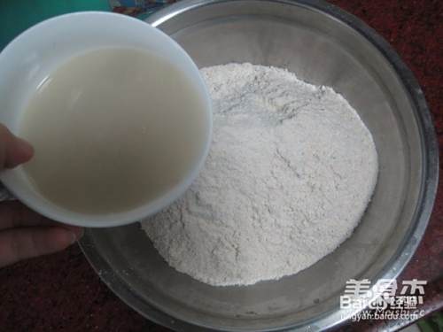 把之前搅拌好的酵母水慢慢倒入预拌粉内。