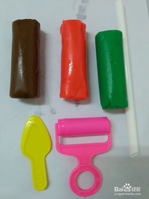 1先将红、绿、褐三色彩泥和小刀、滚子准备好。