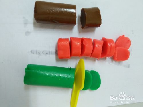 将红色彩泥用小塑料刀切成七份,两份小号的,两份中号的,三份大号的。绿色的切两小块。褐色的切一大块。备用。