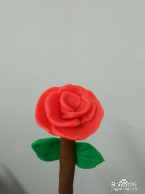 把绿色的两片安在花朵下方的褐色茎上,捏牢。有叶脉的一面朝前。一朵漂亮的玫瑰花就做好了。