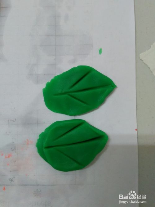 把两小块绿色的斡成中间宽、两头窄的片,一端捏出尖。