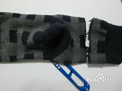 再在袜口的地方剪掉一块袜子,留着待会用。