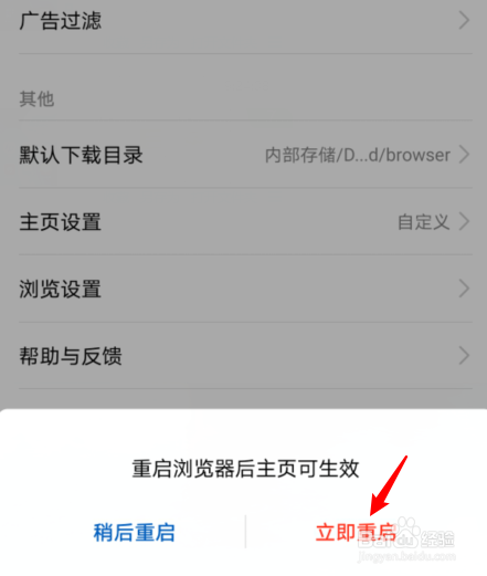 点击下方的立即重启,即可设置华为浏览器的主页。
