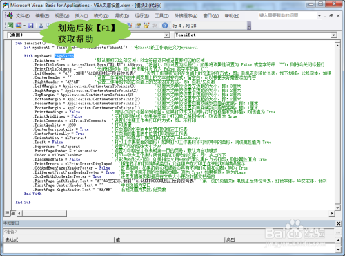 在VBA程序里面遇到不明白的,可以直接下划取词(主要是函数属性之类的关键词汇),按下【F1】键获取帮助信息,也可以直接在搜索框里面输入关键词进行搜索,或者通过网上搜索获取。