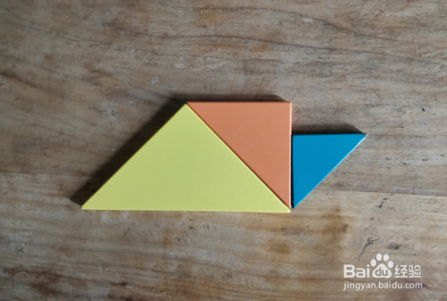 摆上余下的小三角形,放在右侧大三角形的右侧挨着,直角在左侧上端,如图。