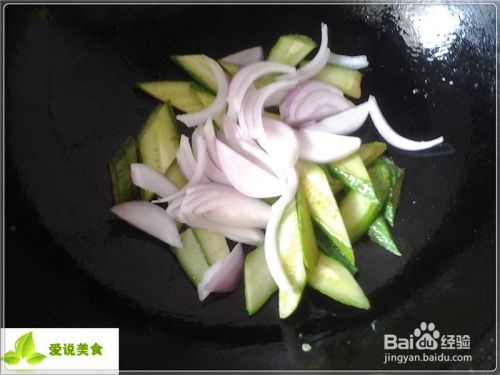 用余下的油把青瓜和洋葱倒入锅一起搅动片刻。