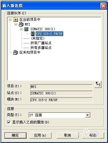 在弹出的“插入新连接”窗口中,选择所需连接的CPU,选择连接类型为s7 connection,单击“应用”按钮建立连接,并弹出连接表连续属性对话框。