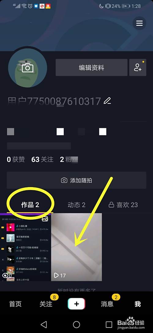 在我们的个人主页的“作品”这里就可以看到自己发布的所有的作品,我们选择要删除的视频作品进入。