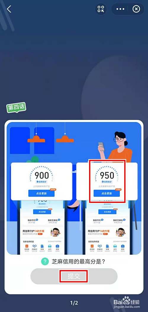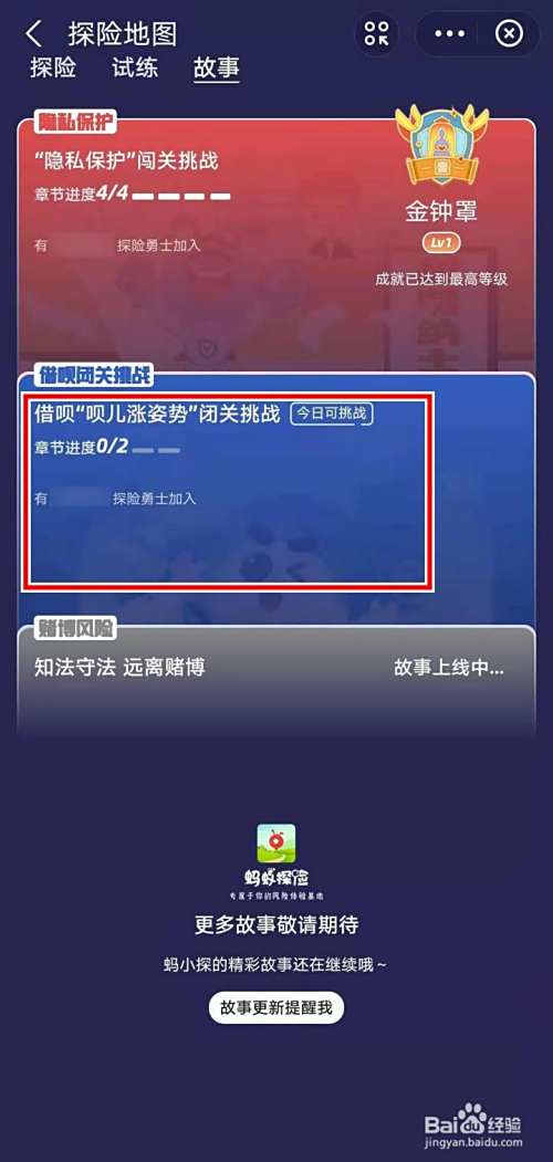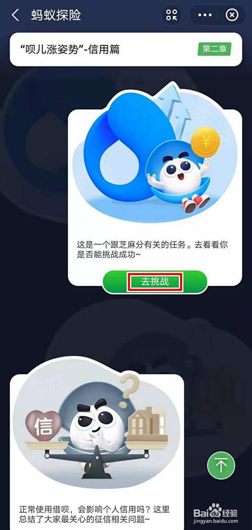 进入借呗闭关挑战页面,故事第二章是呗儿涨姿势信用篇,第四话是关于芝麻分的,点击去挑战;