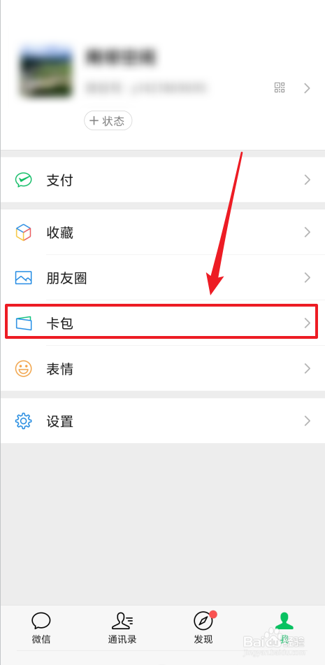 登录微信所,在“我”界面上点击“卡包”所在行。见下图