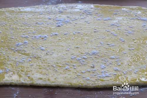4、把醒发好的面团揉搓排气后,撒适量干面粉,然后擀成长方形大薄饼,刷一层植物油,撒适量盐、干面粉;