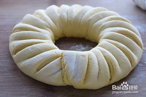 6、切成斜刀然后在每个斜刀中间用筷子压一下,盘成圆形。放在温暖的地方二次发酵至体积明显变大;