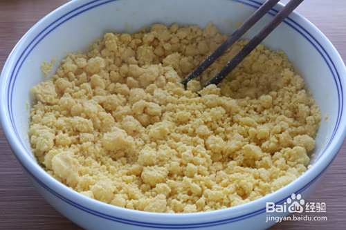 1、准备200克玉米面,用大约200克的开水烫面,拌成这种小颗粒的状态;