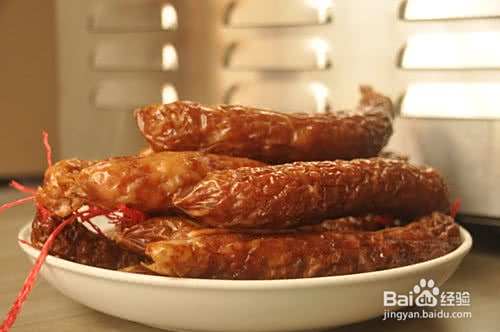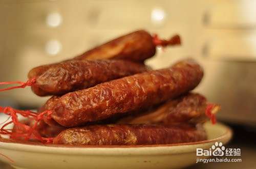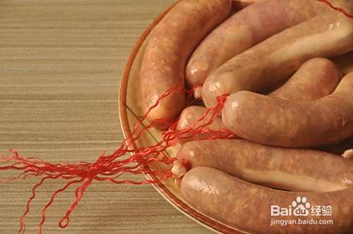 准备好肠衣,绳子,用灌肠机灌好腊肠,然后分段挤压腊肠里空气,再用绳子扎紧腊肠,腊肠长度在30厘米内为宜