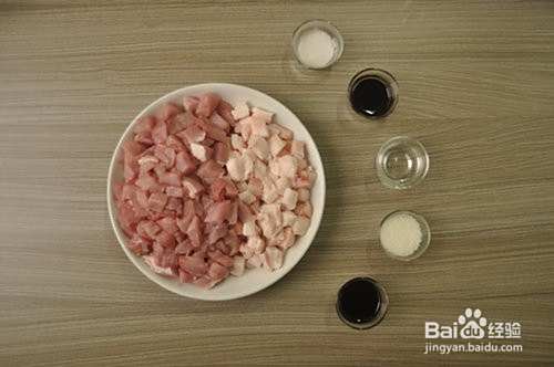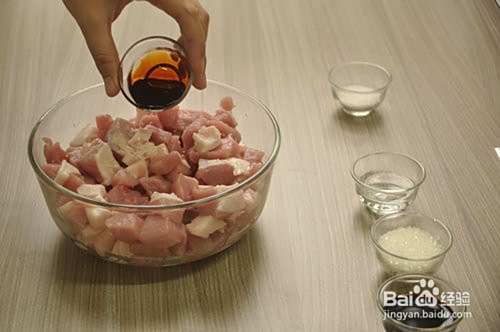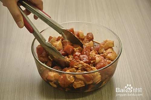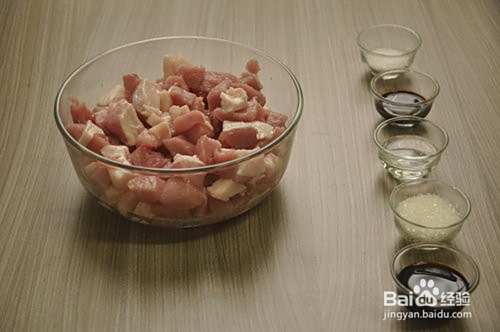准备盘子,猪肉洗净晾干水分,把肉切成小块,肥肉比瘦肉略小,把猪肉和所有辅料全部倒进去