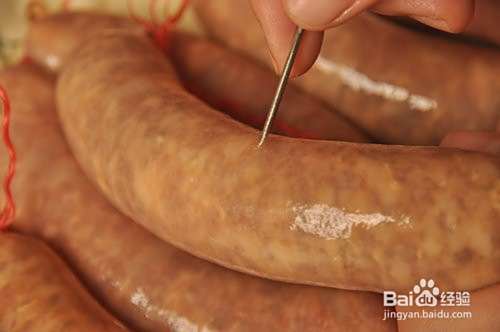 再用针扎去腊肠的气泡,为了风干过程更好地出油