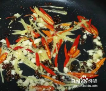 5锅底留少许食用油,加上胡萝卜煸炒,加上一些小米椒或者青椒丝,小火将两者翻炒均匀。