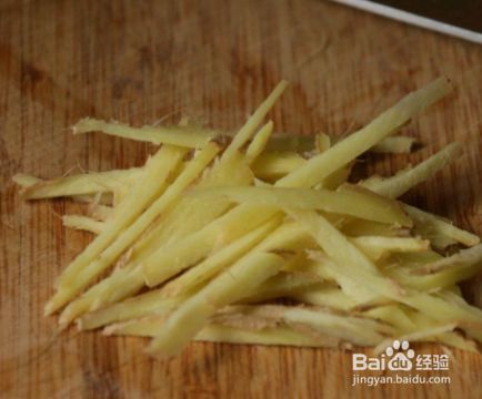 3等待猪肉丝腌制好,将生姜也要切成细丝留作备用。