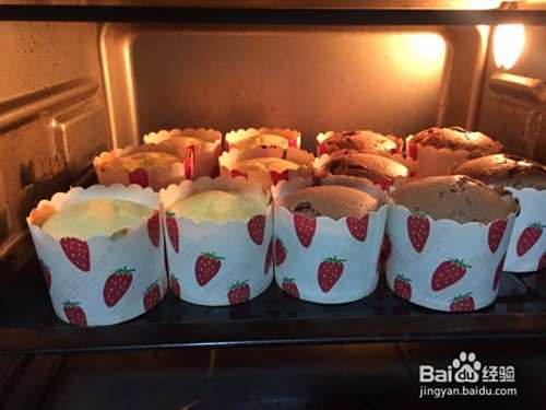 把剩下的面糊倒入放过夹心的纸杯蛋糕中,放入烤箱继续烤